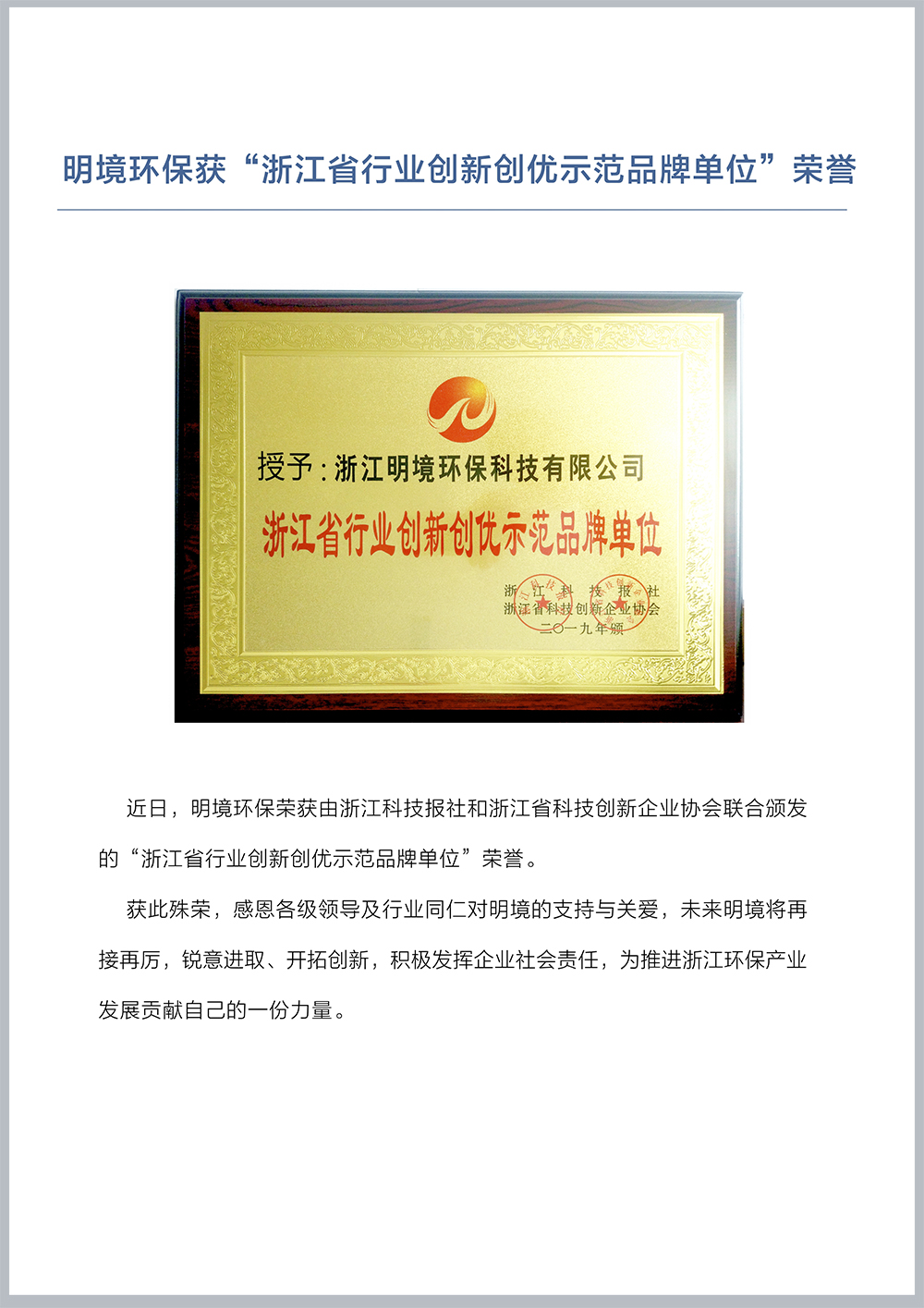 明境環(huán)保獲“浙江省行業(yè)創(chuàng)新創(chuàng)優(yōu)示范品牌單位”榮譽