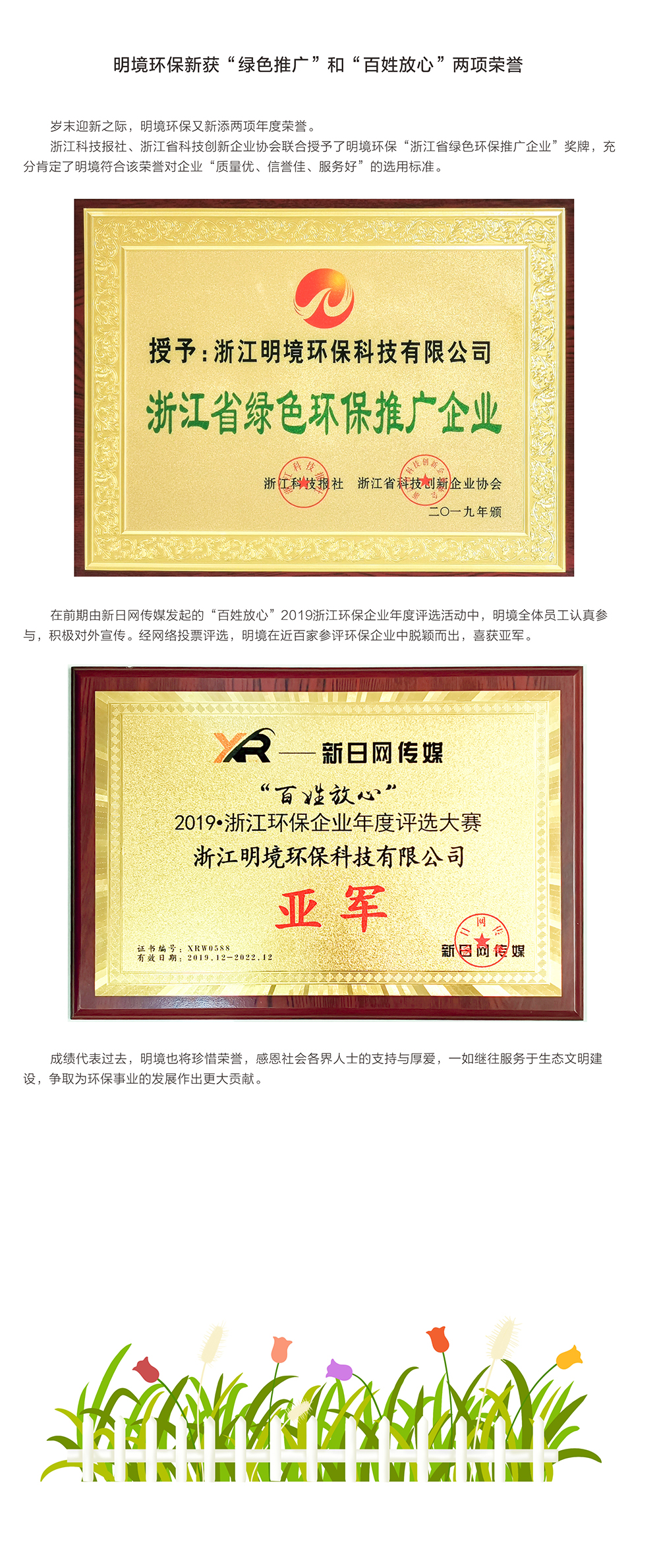 明境環(huán)保新獲“綠色推廣”和“百姓放心”兩項榮譽(yù)